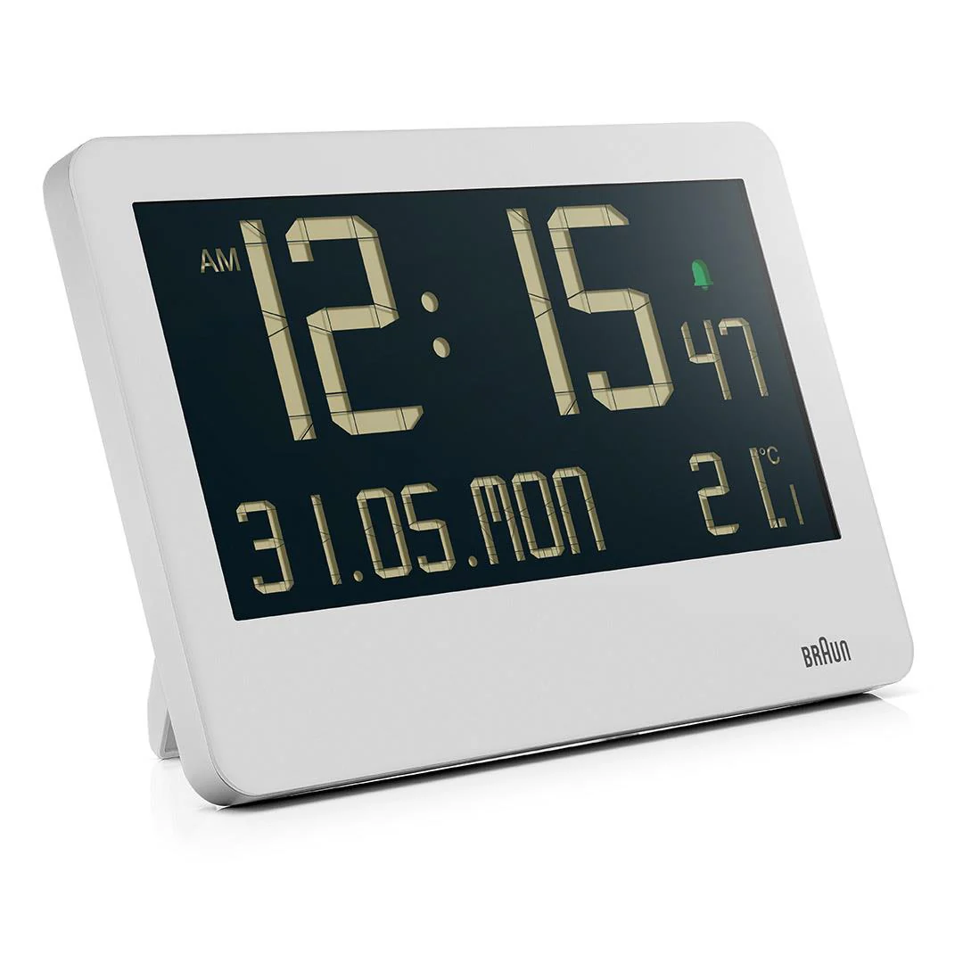 Braun Digital Wall Clock with Indoor Temperature, Date, Day of the Week, Large Reverse LCD Display, Quick Set, Beep Alarm in White, model BC14W.