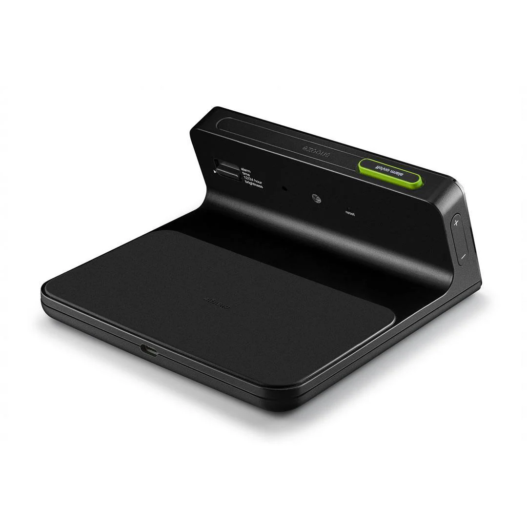 The design of the BC21 naturally encourages the user to place their device on the wireless charging pad which sits behind the self-adjusting LCD display, out of sight, out of mind. The design takes a modern-day problem of too much screen time and provides a simple solution. At 10W the changing pad is fast charging and compatible with all Qi enabled products. The silicone charging pad prevents devices overheating and provides a non-slip surface area.